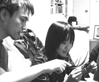 ■とうとうその日が来た。京都から松倉がやってきたのだった。 ■夕方、いま新宿にいるとの電話。迎えに行こうかと思ったが初台まで来れる、一度来たことがあるからわかるという。しばらくすると電話が掛かってきてやっぱり迷っていた。道を少し説明して迎えに行くと、遠くのほうから「宮沢さん」とよく通る声。松倉だった。近くにいた人がびっくりするような声だ。六時近くになってわが家に集合したのは、松倉、ヨミヒトシラズのT君、伊勢の三人。それぞれの紹介が一通りすむと、食事をしながらライブのことを相談する。写真はなにかを見ているT君と松倉。